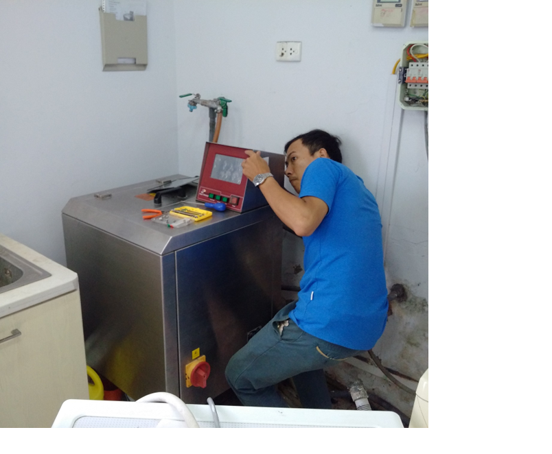 • Ảnh dưới là các kỹ sư của công ty đang kiểm tra và sửa chữa máy đo độ bền màu sau giặt của Atlas , tại công ty Thygesen.