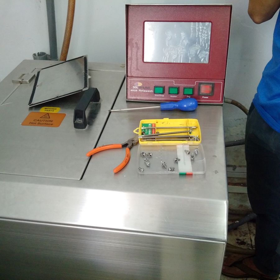 Kỹ sư đang kiểm tra và sửa chữa máy đo độ bền màu sau giặt của Atlas , tại công ty Thygesen.