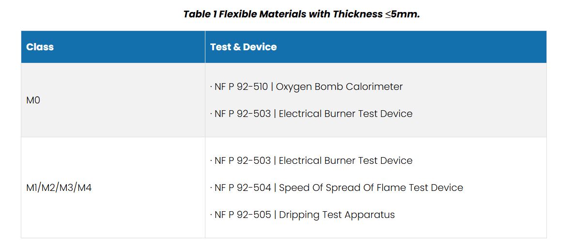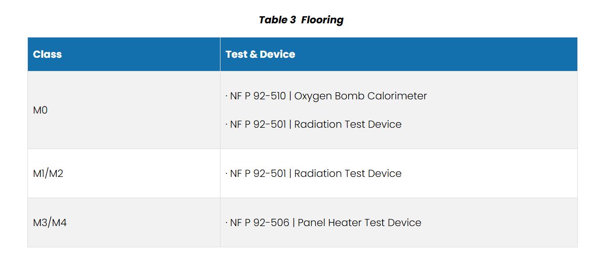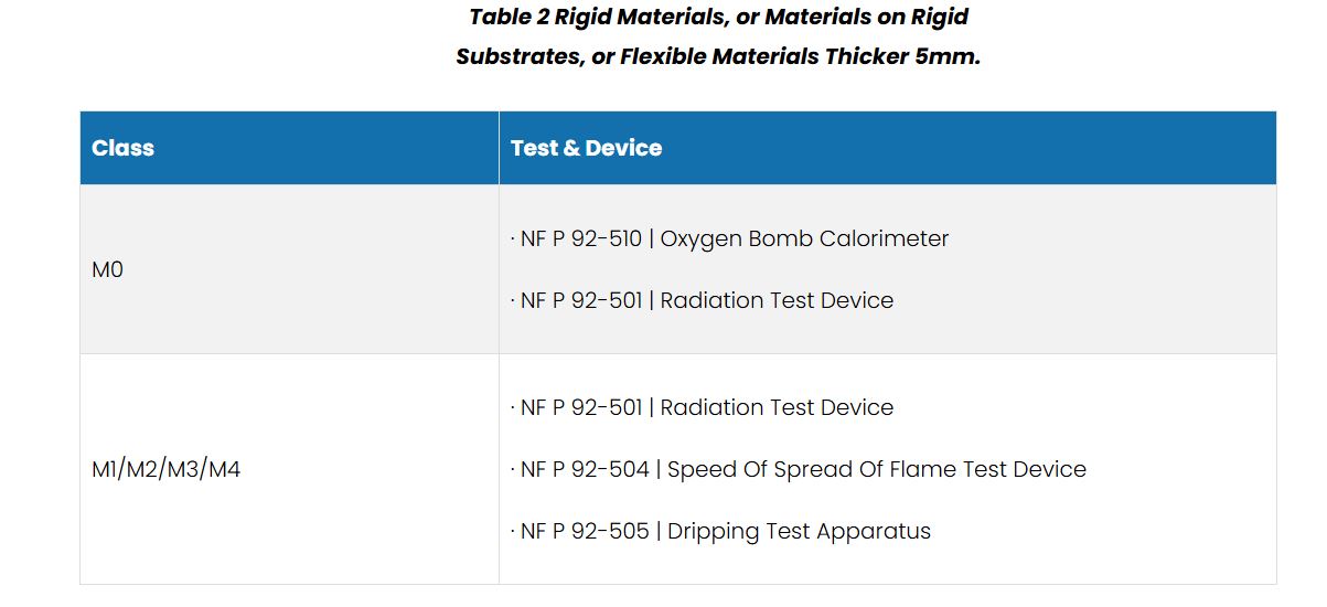 Tiêu chuẩn NF P 92-507 phân loại vật liệu xây dựng dựa trên phản ứng cháy thành các hạng từ M0 đến M4: