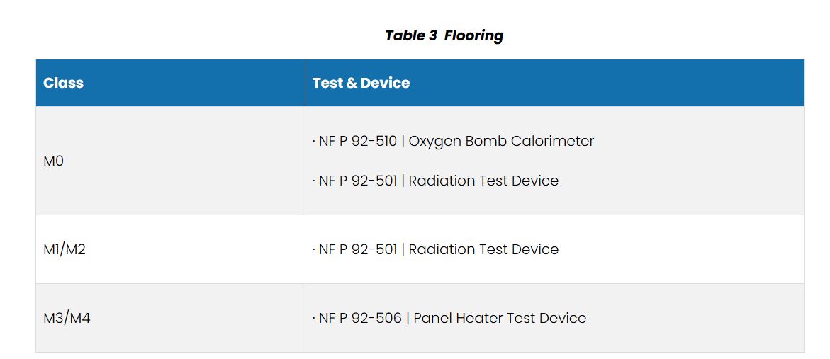 • Các thử nghiệm "Phản ứng với lửa" phân loại vật liệu thành 5 loại từ M0 đến M4. Tiêu chuẩn cụ thể áp dụng tùy thuộc vào mục đích sử dụng và xác định phương pháp thử nghiệm cho tất cả các vật liệu.