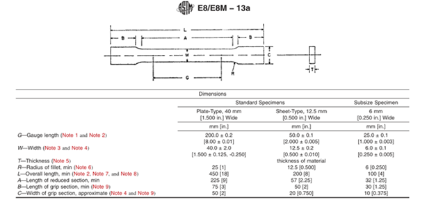 Theo tiêu chuẩn ASTM E8, mẫu thép tấm sẽ có kích thước như trong bảng 1. Mẫu thử được lấy từ vật liệu hình tấm, phẳng và có chiều dày danh nghĩa từ 5mm trở lên.