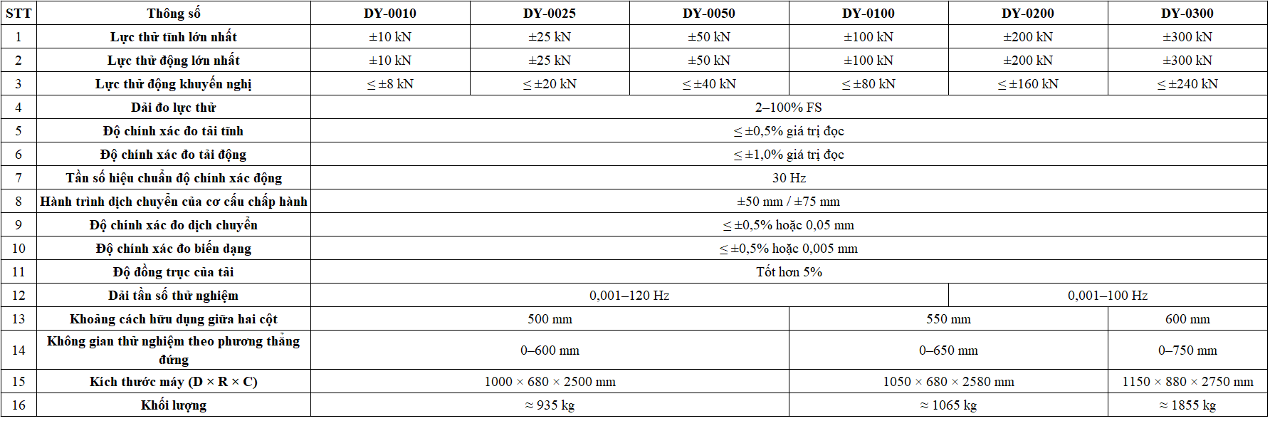 THÔNG SỐ KỸ THUẬT HỆ THỐNG THỬ NGHIỆM DY-D