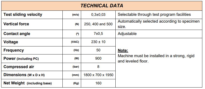 - Purpose: Determining the coefficient of friction between footwear, its components, and floorings, according EN ISO 13287; EN ISO 24267; EN ISO 20344; ASTM F2913; SATRA TM144.