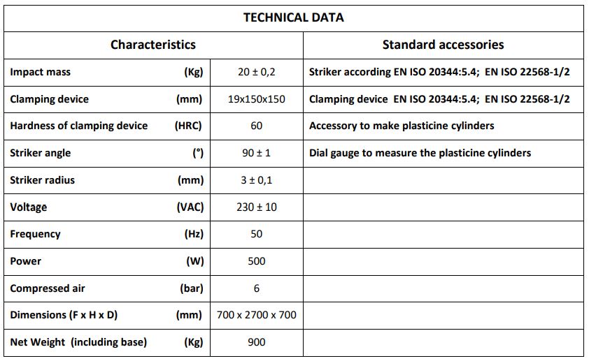 - Purpose – assess impact resistance of toe caps for safety and protective footwear, according EN ISO 20344:5.4; EN ISO 22568-1; EN ISO 22568-2; ASTM F2413-11; CSA Z195, depending on of the devices and tools