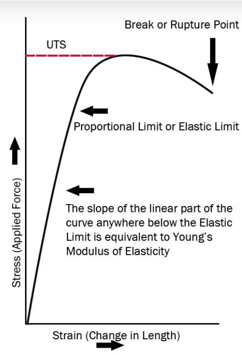 - Một trong những tính chất quan trọng nhất mà chúng ta có thể xác định về vật liệu là độ bền kéo cuối cùng (UTS) của nó. Đây là ứng suất tối đa mà mẫu vật chịu được trong quá trình thử nghiệm. UTS có thể tương đương hoặc không tương đương với độ bền của mẫu thử khi đứt, tùy thuộc vào việc vật liệu giòn, dễ uốn hay thể hiện các đặc tính của cả hai. Đôi khi một vật liệu có thể dẻo khi được thử nghiệm trong phòng thí nghiệm, nhưng khi được đưa vào sử dụng và tiếp xúc với nhiệt độ cực lạnh, nó có thể chuyển sang trạng thái giòn.